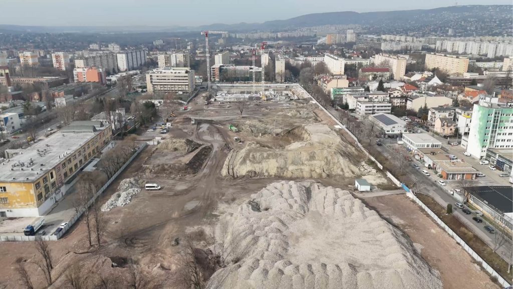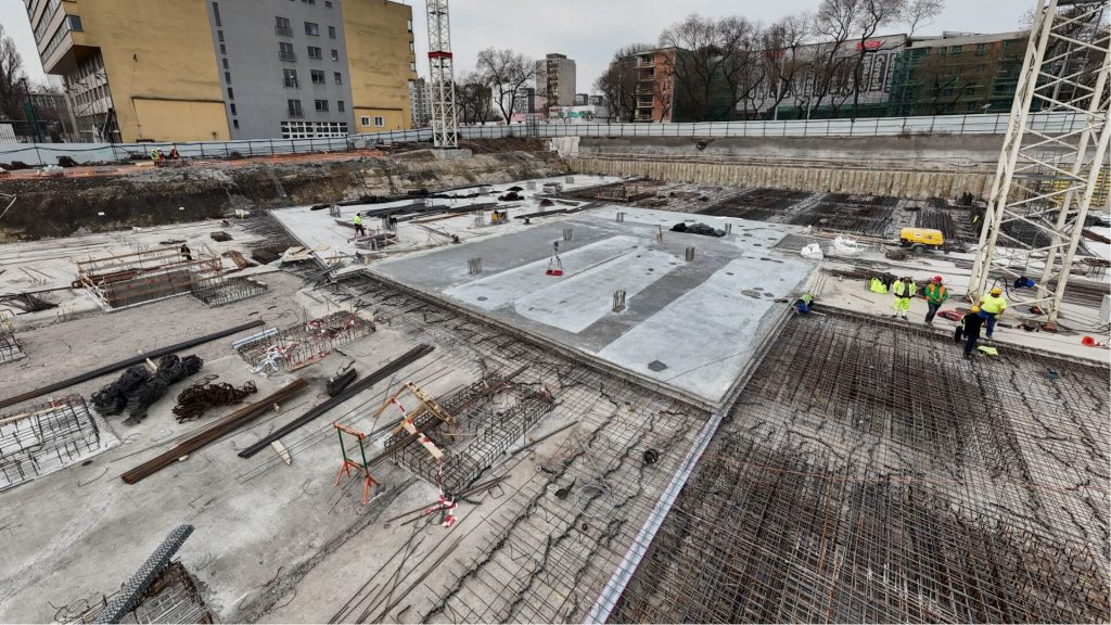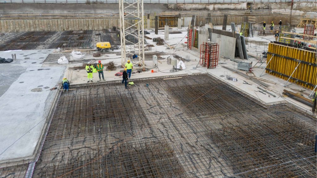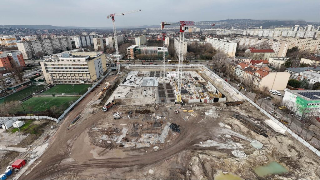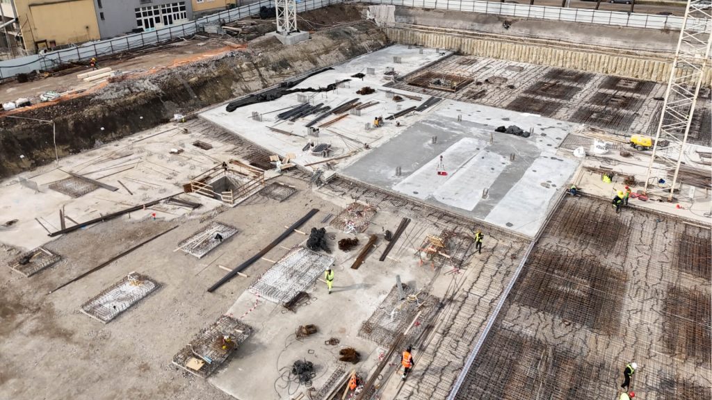 A projekt a tervek szerint halad az egyik legfontosabb szerkezeti szakaszban, az alapozási fázisban. Februárban megkezdődött az alaplemez építése, amelynek befejezését március 31-re tervezzük. Ez az épület stabil alapja: erre a kulcsfontosságú szerkezetre épül majd a teljes felszerkezet. Az alaplemezbe, cölöpfejekkel együtt, közel 5 000 m³ beton és mintegy 600 tonna betonacél kerül – ami több száz mixerautónyi szállítást és több tucat vasúti kocsi acél tömegét jelenti.