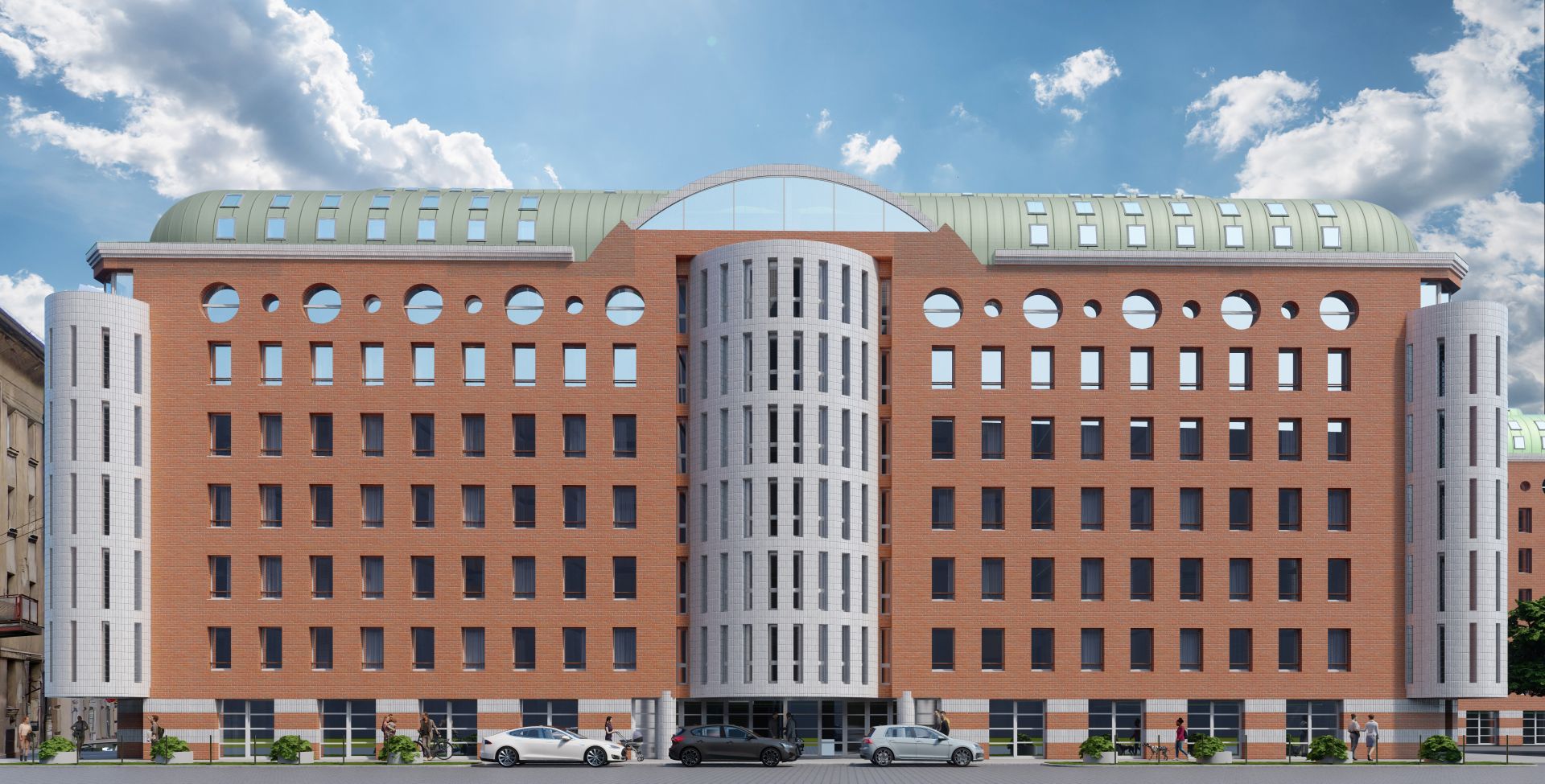 Az épület külső homlokzatát átszellőztetett téglarendszer borítja, amely egyszerre nyújt modern megjelenést biztosít.