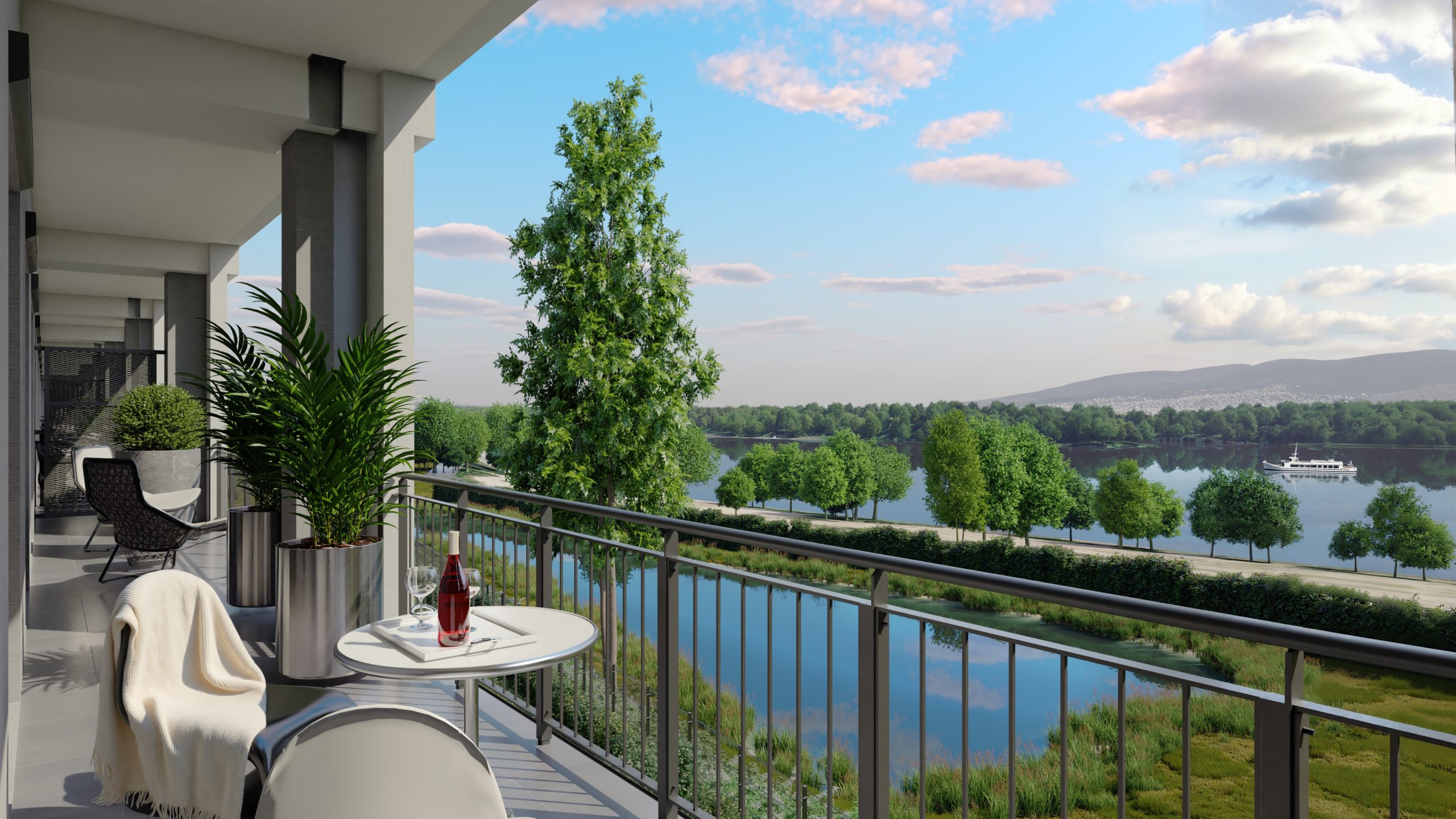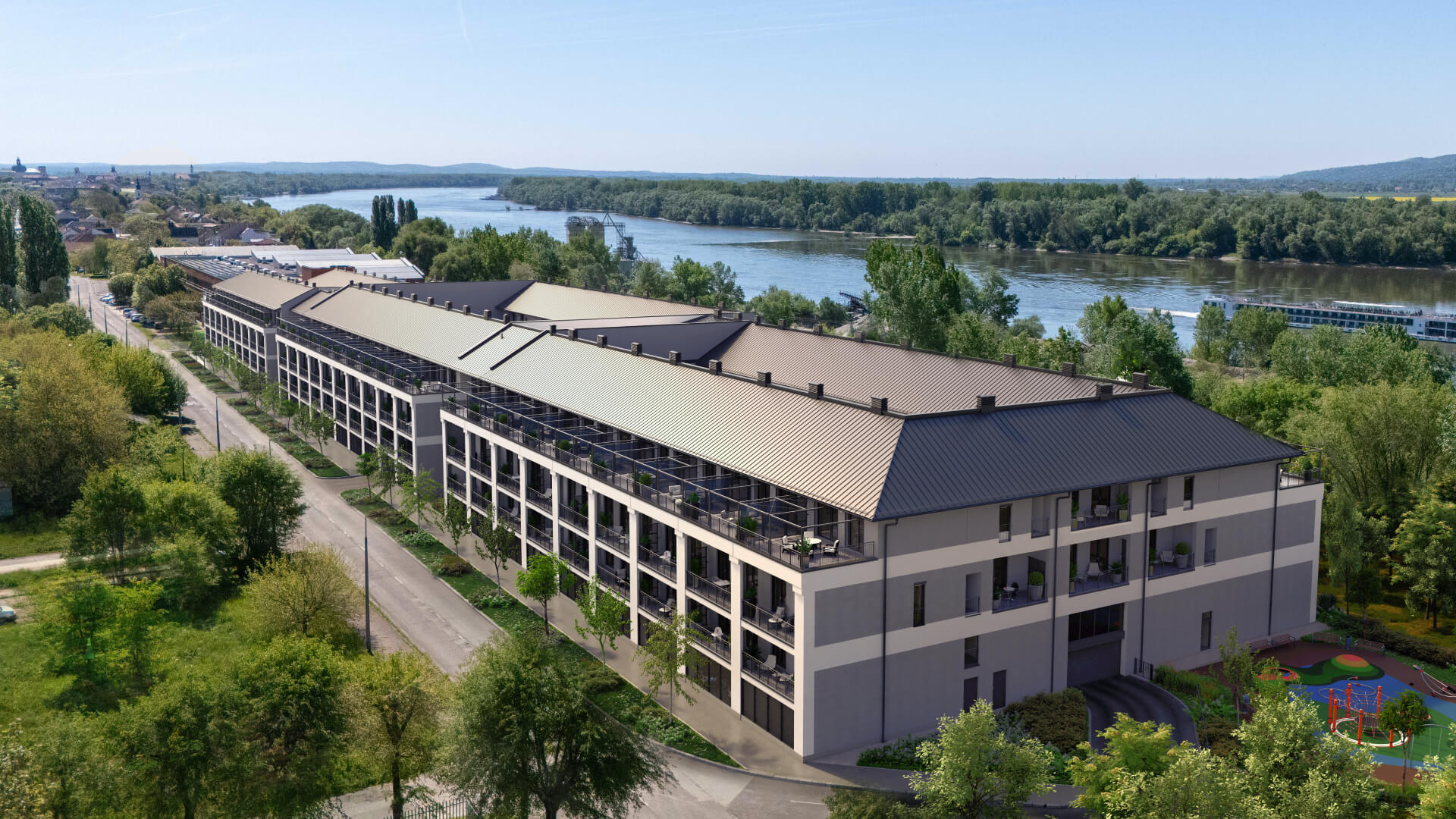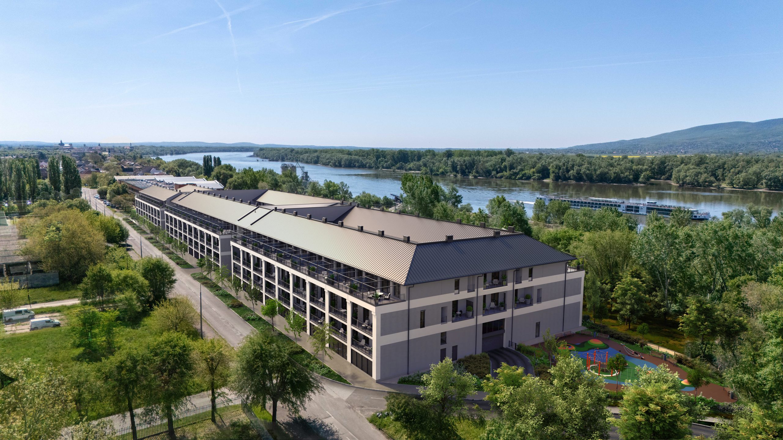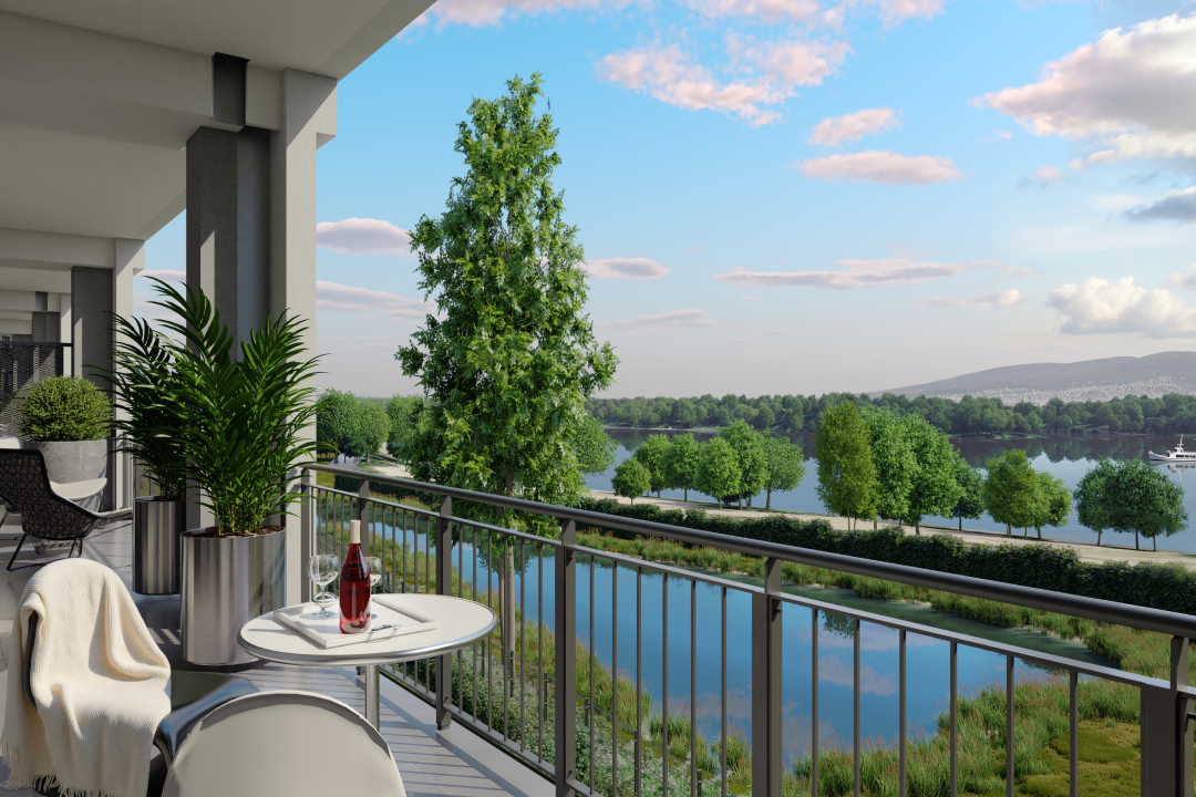 A látványtervek azt is érzékeltetik, milyen itt élni: teraszról nyíló kilátás a zöld udvarra vagy a folyó irányába, napfényes nappalik és olyan külső terek, ahol egy reggeli kávé, egy délutáni pihenés vagy egy esti séta a Duna-parton természetes része lehet a mindennapoknak.