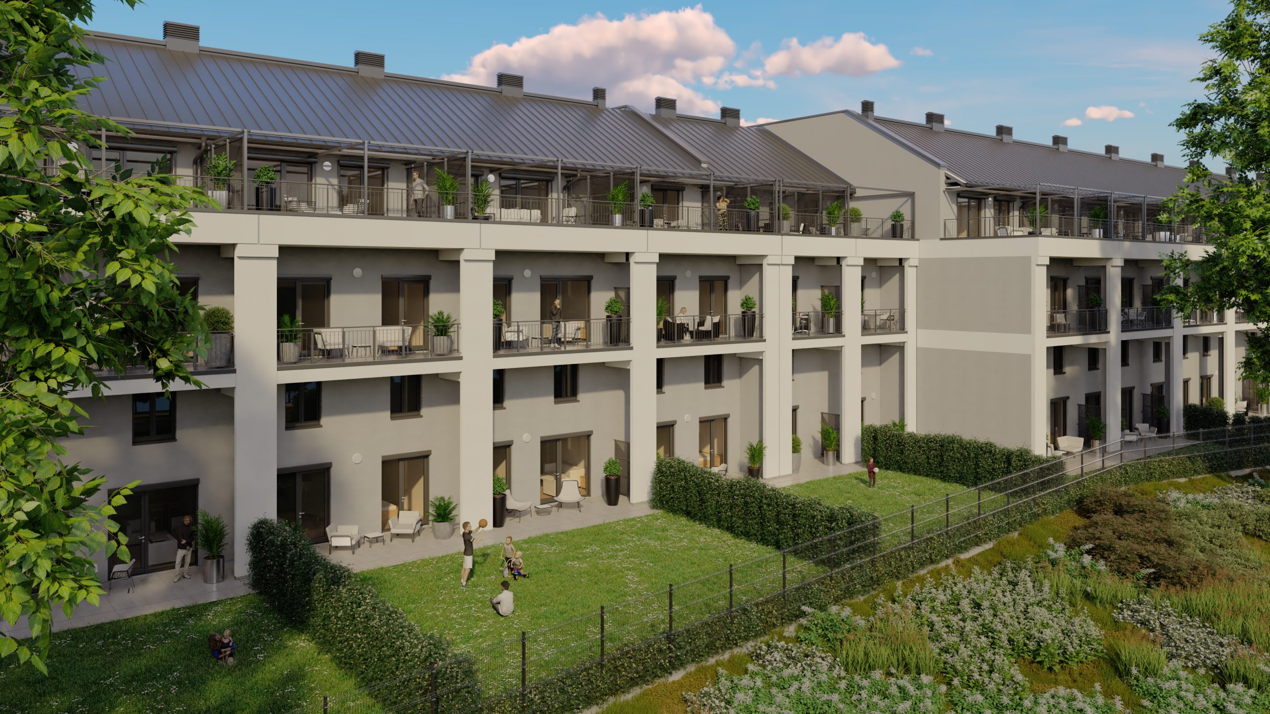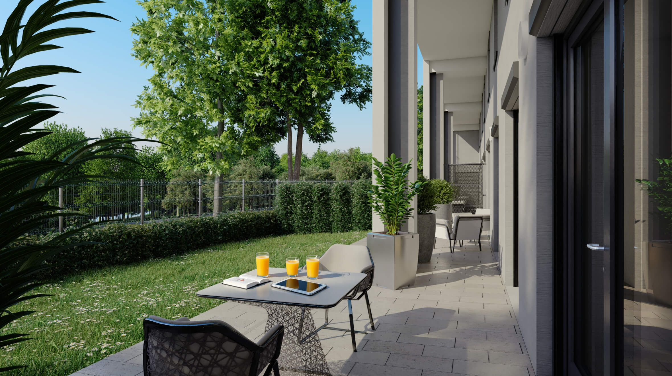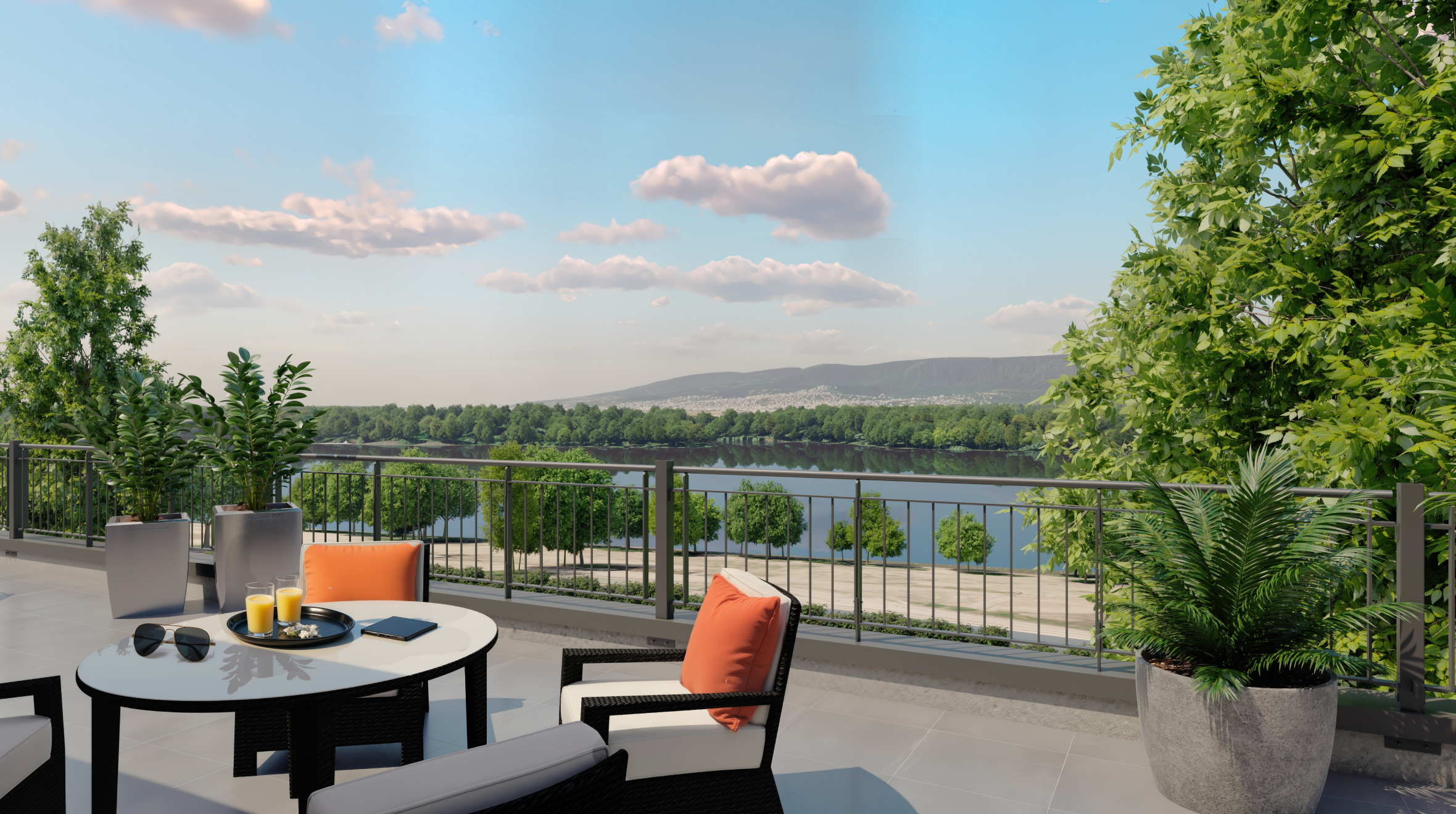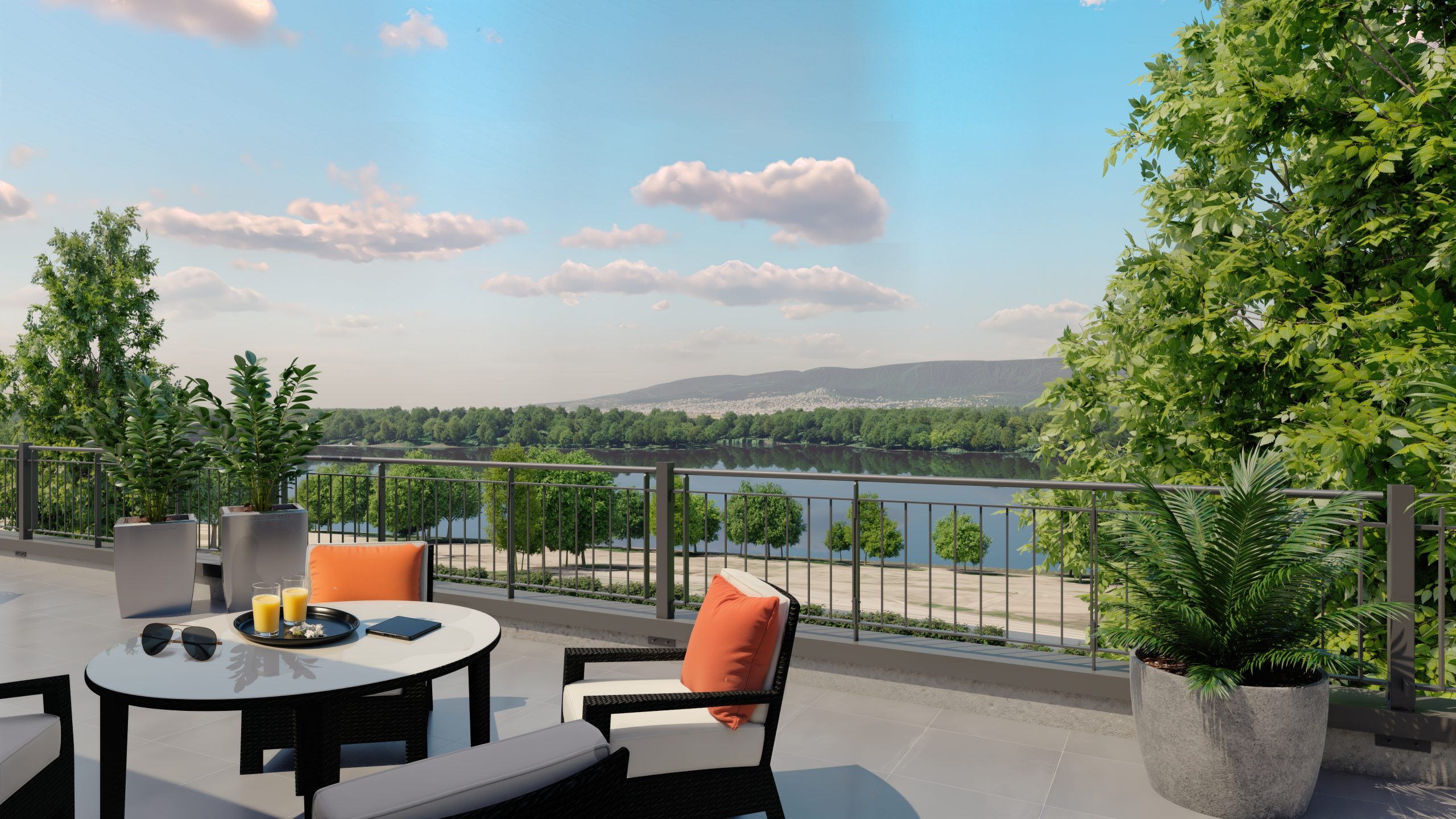A látványtervek azt is érzékeltetik, milyen itt élni: teraszról nyíló kilátás a zöld udvarra vagy a folyó irányába, napfényes nappalik és olyan külső terek, ahol egy reggeli kávé, egy délutáni pihenés vagy egy esti séta a Duna-parton természetes része lehet a mindennapoknak.
