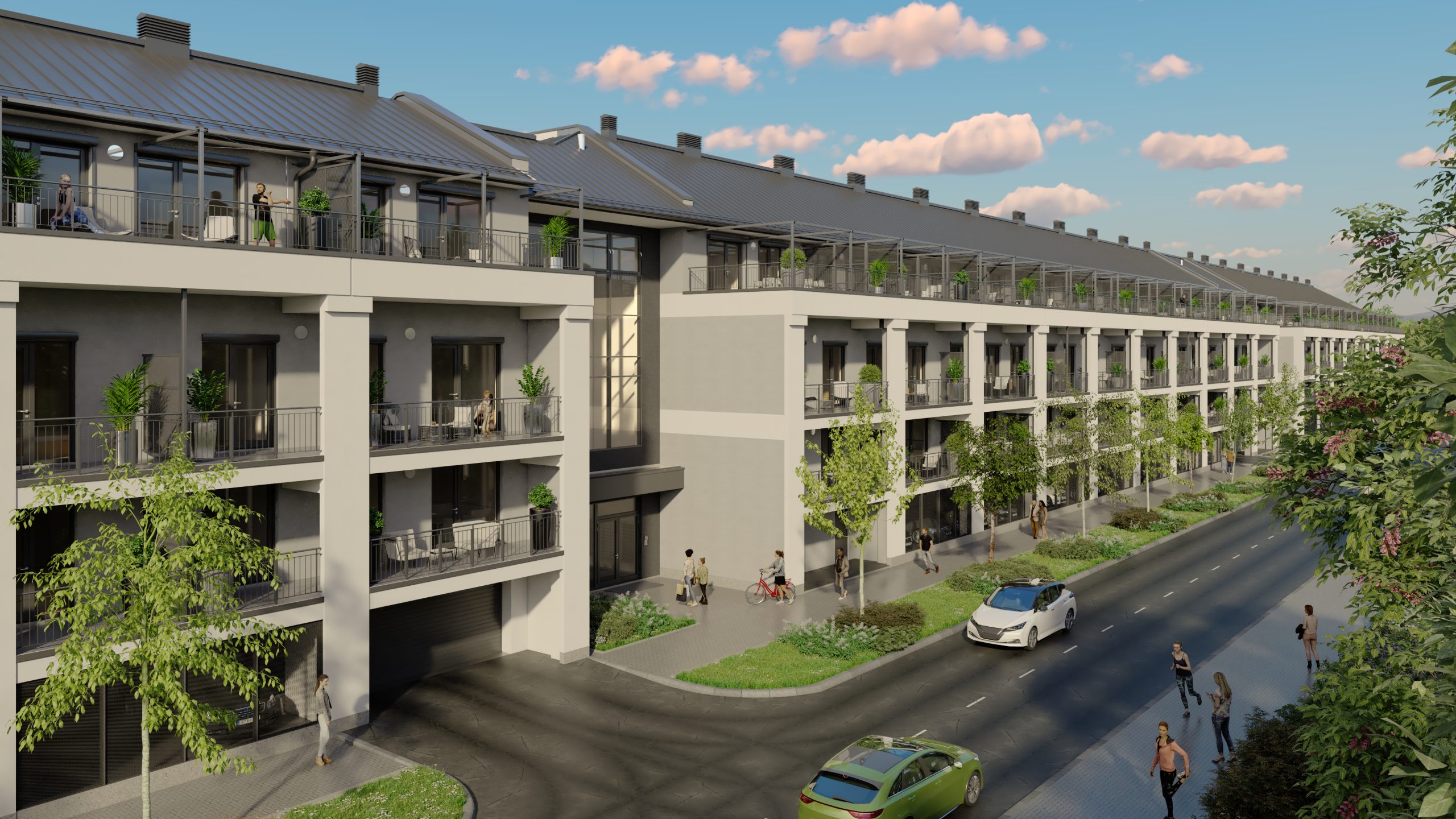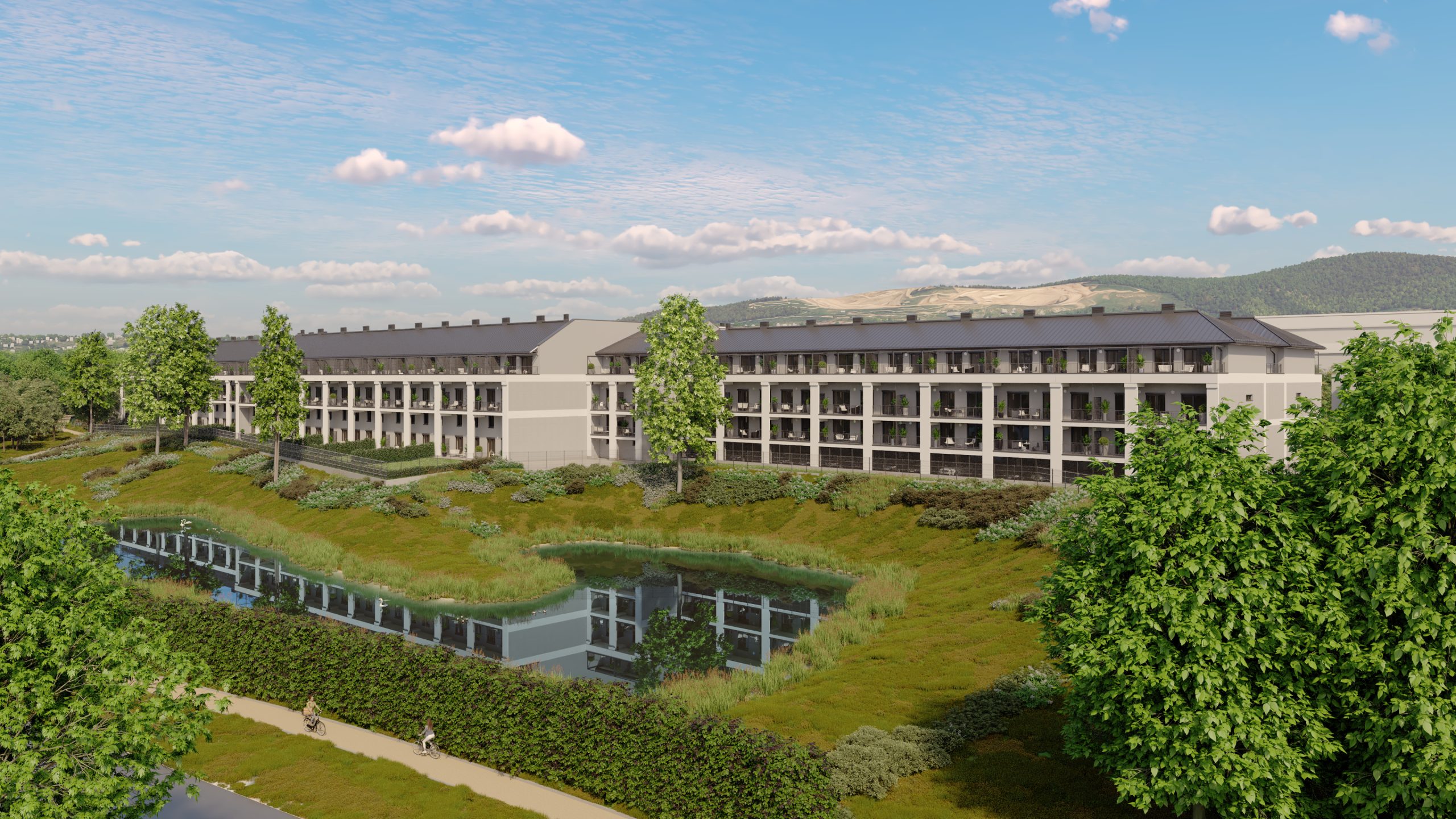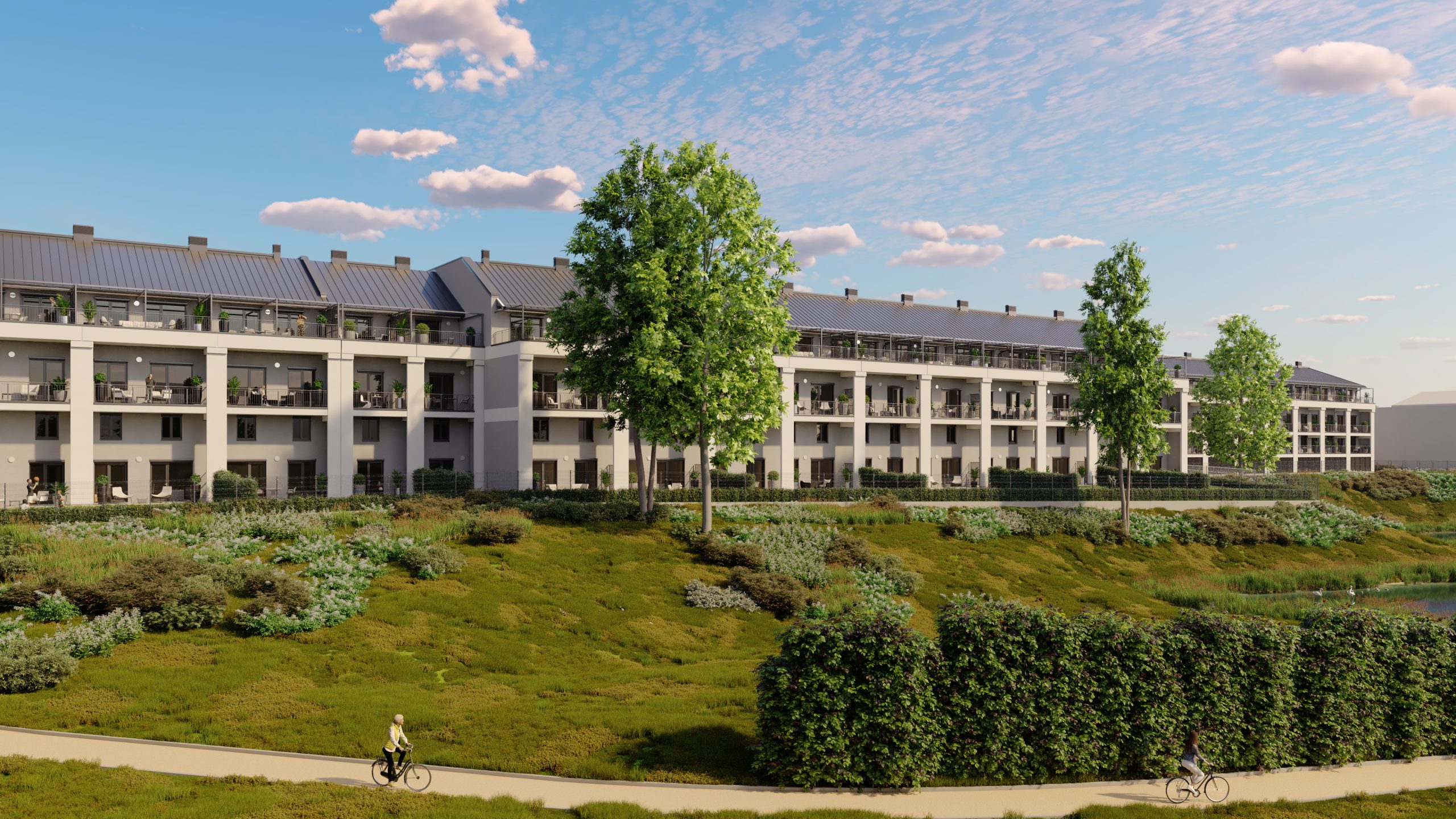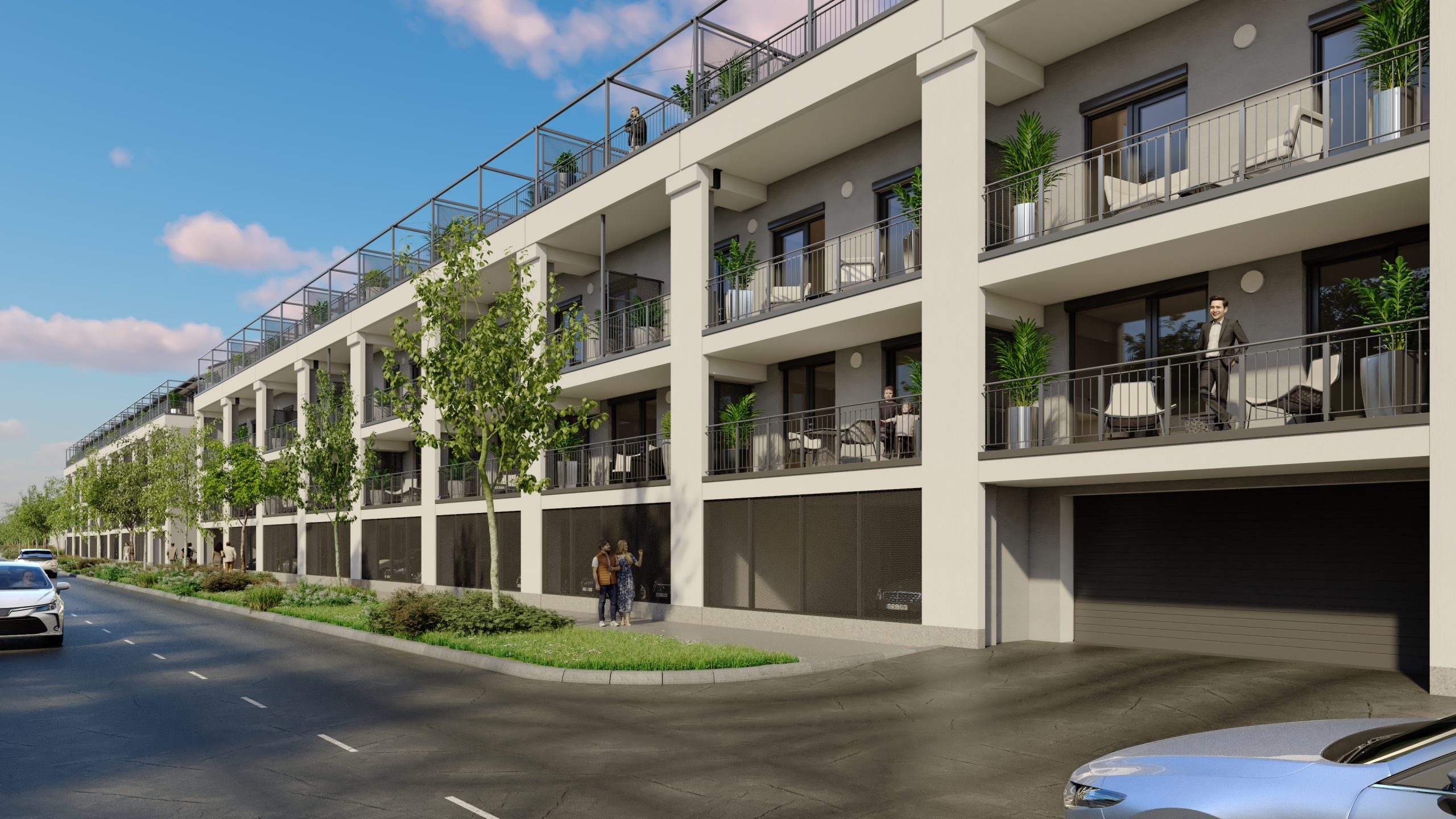A látványtervek azt is érzékeltetik, milyen itt élni: teraszról nyíló kilátás a zöld udvarra vagy a folyó irányába, napfényes nappalik és olyan külső terek, ahol egy reggeli kávé, egy délutáni pihenés vagy egy esti séta a Duna-parton természetes része lehet a mindennapoknak.