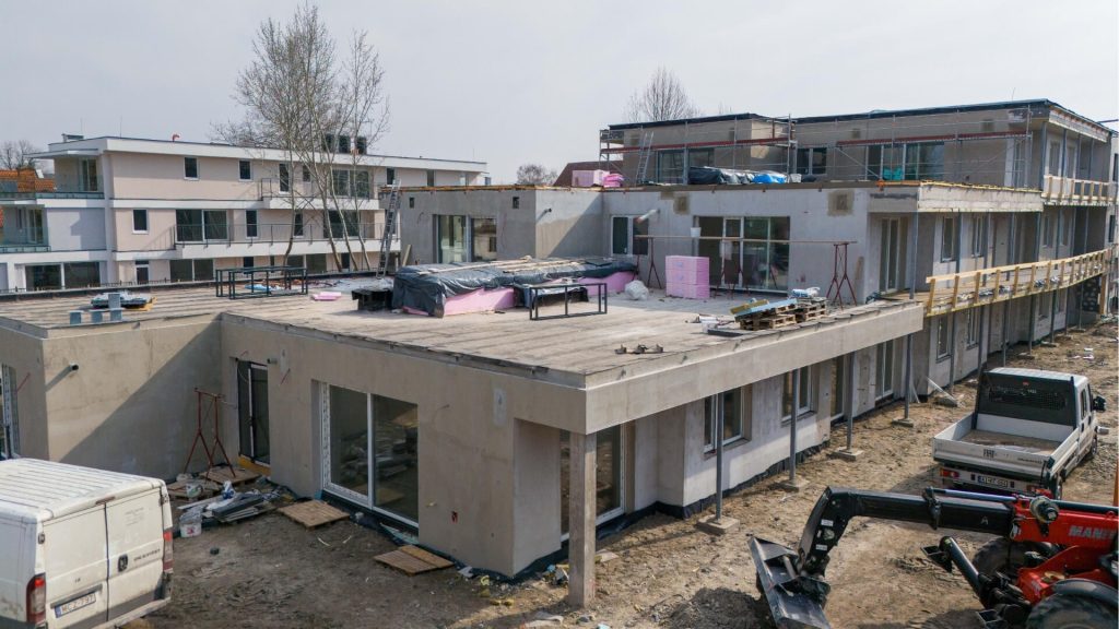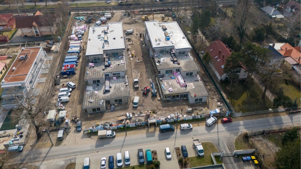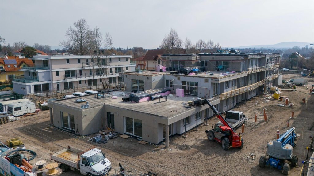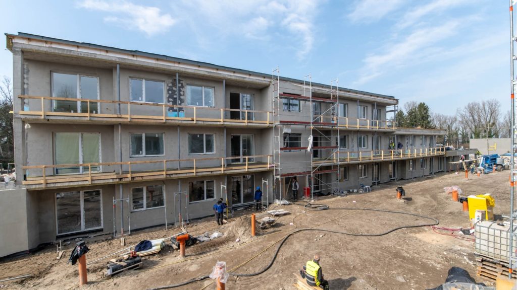 A My Lelle lakópark építkezése egyre látványosabb szakaszába érkezett. Az elmúlt hetekben több fontos munkafolyamat is új szintre lépett: az épületek külső kialakítása már szinte teljes, miközben a lakások belső tereiben is a befejező munkák zajlanak.