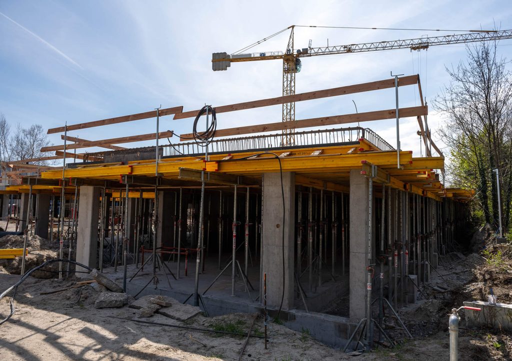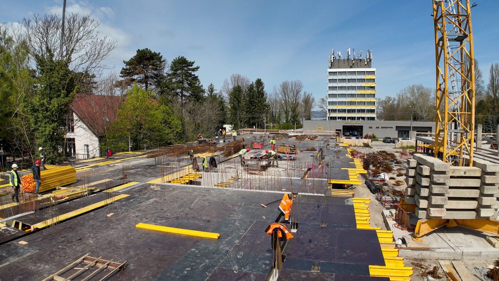 Az „A” épületnél befejeződtek a földszint feletti födémszerkezeti munkálatok, április közepére elkészültek az első emeleti falak, és megkezdődött a következő szint födémének zsaluzása is. A kivitelező emellett a térelhatároló falak alatti vízszigetelési munkákat is elkezdte, amelyet közvetlenül a falazás követ. Az épület rövidesen újabb szakaszába lép: hamarosan megindulnak a betonozási munkák.